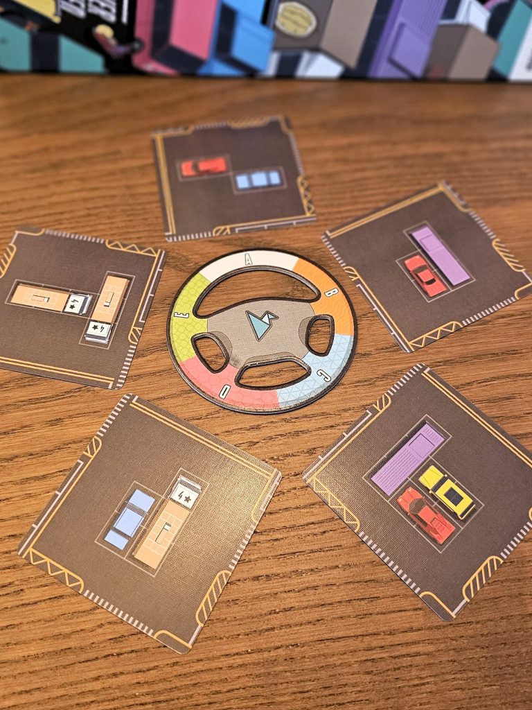 On each player’s turn, they turn the steering wheel to choose a pattern of vehicles to place in their lot – and this, in turn, leaves each other player with a different set of vehicles that they too must place. This keeps everyone engaged and ensures the game moves at a good pace, which is perfect for players who don’t like long downtime (…like us).
